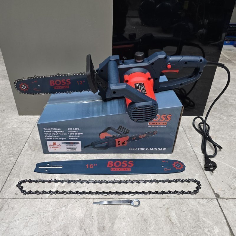 ⭐ اره زنجیری برقی ۳۰ و ۴۰ سانت دو ساطور باس ✔ دارای دو عدد تیغه به طول ۳۰ و ۴۰ سانت ✔ سیستم پاشش روغن ✔۲۵۰۰ وات ✔ سیم پیچ تمام مس ✔ خوش دست